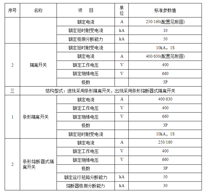 2.3.11在運用中能夠交換的具有同樣額定值和結構的組件,應具有交換性。3標準技術參數技術參數特性表是對收買設備的基礎技術參數要求,供貨方應對技術參數特性表中標準參數值進行呼應。低壓電纜分支箱技術參數特性見表3