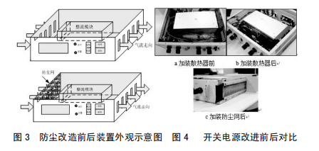 3.2在裝置本體進風孔加防塵網,防止灰塵進入裝置內部,設備維護人員定期對濾網進行清掃,從而減輕元器件表面覆塵,利于裝置正常散熱,如圖3所示加裝防塵網后開關電源示意圖。對裝置實施上述改進后,其改進前后對比如圖4所示。