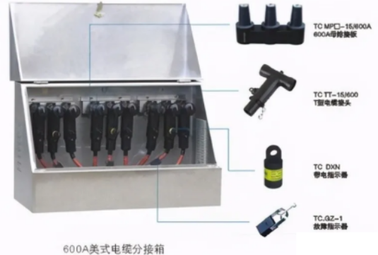 1)美式電纜分支箱,它以單向開門、橫向母排為主要特點(diǎn),具有寬度小、組合靈活、全絕緣、全密封等顯著優(yōu)點(diǎn)。600A主回路采用旋入式螺栓固定連接;分支回路采用拔插式連接。