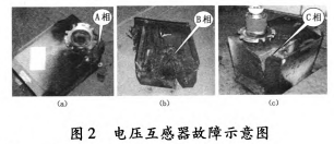 2011年3月30日0:38,35kV垣潔線、35kV垣宏回A、B相電壓互感器擊穿,如圖5所示;2012年3月26日19:7:58,35kV垣潔線56號線路電壓互感器A、B、C相損壞,A、B相有炸裂現(xiàn)象。