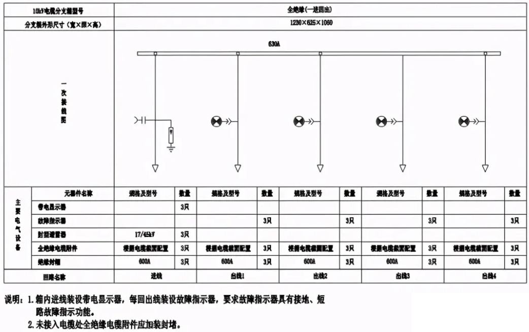 電纜分支箱用于非骨干回路的分支線路,作為結尾負荷接入用電使用,適用于中小客戶會集區域進行負荷分接時的接入用電,不應接入骨干環網及聯絡。電纜分支箱選用電纜進線1回,出線2回或4回,出線回路數可根據使用需要選用,額定電流為630A。選用全絕緣、全封閉、全屏蔽可觸摸式結構,以及采納防凝露、防內部毛病電弧外泄等措施。
