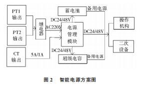 2.6智能電源環網柜的操作安排、控制器、通訊終端等二次設備都需求完結不間斷供電。為了前進供電的可靠性,要求在供電電源失電時,二次回路依然會有電源,能夠繼續可靠的動作,環網柜中有必要具有備用電源。為了前進供電電源的可靠性本電源的規劃首要選用了如下方法:(1)環網柜一般選用雙進線,兩條進線互為備用給電源的充電模塊供電,當其中一條進線失電時,由繼電器將另一條進線的220V電源轉給充電模塊,確保整個柜子的二次回路繼續供電。(2)當環網柜的兩條進線都失電的時分,為了使二次回路繼續帶電,需求由備用電源繼續供電?,F在首要的備用電源是不間斷電源(UPS)和蓄電池,還有的選用超級電容供電。為了前進供電的可靠性,本電源方案選用蓄電池與超極電容相結合,兩種電源可互為備用,能夠進一步前進供電的可靠性。智能電源的方案如圖2所示。
