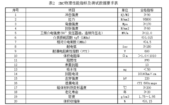 2.3.1分支箱外殼選用S304不銹鋼資料,箱體、門體資料厚度均不應小于2毫米,或SMC復合資料箱體,SMC物理功用方針及測試數據滿足表2的要求。